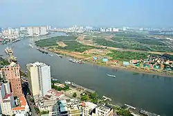 Thủ Thiêm is situated on a point bar of the Saigon River, which also references as Thủ Thiêm Peninsula, in the municipal division known as Thủ Đức. On the opposite bank of the river are the Bình Thạnh District, District 1—Ho Chi Minh City's central business district—District 4 and District 7. It includes some wards of Thủ Đức like: Thủ Thiêm, An Lợi Đông and a part of An Khánh.