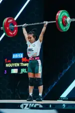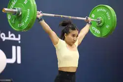 Nguyen clean and jerking 96 kilograms at the 2023 World Weightlifting Championships, held in Riyadh, Saudi Arabia.