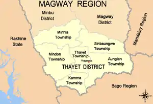 Thayet District (Burmese: သရက်ခရိုင်; also Thayetmyo District) is a district of the Magway Region in central Burma (Myanmar).[1] The administrative centre is the town of Thayet.