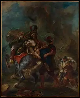 The Abduction of Rebecca is a mid-19th century painting by French artist Eugène Delacroix. Done in oil on canvas, the work depicts the a scene from Sir Walter Scott's novel Ivanhoe in which the heroine Rebecca is abducted. Delacroix produced the painting during the height of the French Romanticist Movement, and presented the work at the Paris Salon of 1846. The 1846 version of Abduction is currently in the collection of the Metropolitan Museum of Art, which describes the work as "one of Delacroix’s greatest paintings".[1] In 1858 Delacroix created an almost identical work for the Paris Salon of 1859; the second version of Abduction is in the collection of the Louvre.[1]