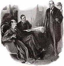 Mycroft Holmes, Sherlock Holmes, Lestrade, and Watson confront Colonel Walter, 1908 illustration by Arthur Twidle