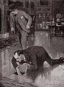![]() Holmes finds the hiding place in the floor, 1904 illustration by Sidney Paget in The Strand Magazine | |