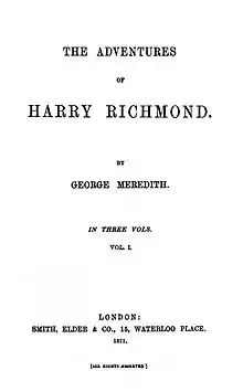 The Adventures of Harry Richmond (1870–71) is a romance by British author George Meredith, sometimes picaresque, sometimes melodramatic. It is believed to be strongly autobiographical in some sections.[1] Meredith intended the book to be a popular success, but the roll-call of reprints shows it to have been so only during Meredith's late-Victorian and Edwardian heyday, his highly-wrought style proving an obstacle for some readers.[2]