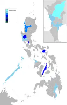 The number of places in a province visited by The Amazing Race Philippines. Includes an inset of Metro Manila showing the cities which were visited by the show.