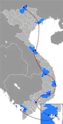 7. ^ Lê Xuân Tiền & Đỗ Mỹ Linh were issued two penalties totalling one hour and 44 minutes (90 minutes for failing to complete the Roadblock, and 14 minutes for breaking seven eggs during the Roadblock). They also received a time credit due to production difficulties. However, neither the penalties nor the time credit affected their placement, and it was unaired.[17]