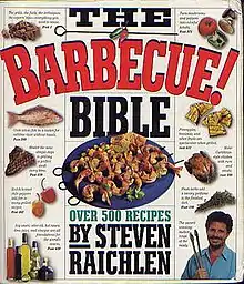 The Barbecue Bible by Steven Raichlen (1998, Workman), is the flagship title in a series of cookbooks written on grilling, barbecue, and other forms of outdoor cooking. Rather than focusing specifically on one style of barbecue, Raichlen documented four years worth of travels along what he considered the great "barbecue belts" in the world, which he categorized as North America/Caribbean, South America, Central Asia/Middle East, Mediterranean Europe, the western regions of Africa from Morocco to South Africa, and the eastern Pacific Rim from Korea to Indonesia. In addition to grill recipes for both meat and vegetables, the book includes substantial information on side dishes, drinks, and desserts, as well as numerous sidebars detailing Raichlen's experiences while researching the book.