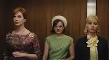 Later, the ladies of the agency leave the office one-by-one. Joan, Peggy, and Faye walk into the same elevator car as the doors close on them.