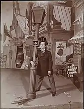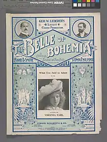 It had been intended that The Belle of Bohemia would open at the Hyperion Theatre in New Haven, Connecticut on 22 September 1900, but the day before its scheduled opening its producer George Lederer found himself in a legal dispute as a result of which four police officers were sent to the Hyperion to ensure the production would not leave New Haven. After some legal maneuvring the production was able to go to New York where it opened at the Casino Theatre on 24 September 1900 and closed on 10 November 1900, having a run of 55 performances.[1][2] Included in the cast were Lotta Faust, Virginia Earle, Sam Bernard as Adolph Klotz, and also featured Trixie Friganza, Sol Solomon, D. L. Don, Fred Titus and John Hyams (all of whom went on to appear in the London production in the following year)[3] with Marguerite Clark making her Broadway début in the production. The musical was produced by George Lederer[4] with music by Ludwig Engländer and Harry Truman MacConnell[5] to a book by Harry B. Smith and with lyrics by Harry B. Smith in a plot that borrows heavily from Plautus and Shakespeare. The case of mistaken identity in the New York version was helped by the fact that the two leading actors, Dick and Sam Bernard were brothers.[6][7] Despite the fact that "the costumes were distinctly not up to the Casino average" and some of the road signs in the scenes were misspelt, the show was generally well received.