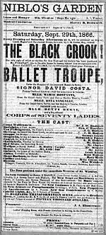 The same year that The Black Crook opened, The Black Domino/Between You, Me and the Post was the first show to call itself a "musical comedy".[2] In the late 1860s, as post-Civil War business boomed, there was a sharp increase in the number of working- and middle-class people in New York, and these more affluent people sought entertainment. Theaters became more popular, and Niblo's Garden, which had formerly hosted opera, began to offer light comedy. The Black Crook was followed by The White Fawn (1868), Le Barbe Blue (1868) and Evangeline (1874).[11] An apparently similar show from six years earlier, The Seven Sisters (1860), which also had an unusually long run of 253 performances, is now lost and forgotten. It also included special effects and scene changes. Gänzl gives The Naiad Queen (1841) as an example of an earlier musical, concluding that it was only The Black Crook's long run that gave it a reputation as the "first" musical.[10] Theatre historian John Kenrick suggests that The Black Crook's greater success, compared with earlier shows, resulted from changes brought about by the Civil War: first, respectable women, having had to work during the war, no longer felt tied to their homes and could attend the theatre, although many did so heavily veiled. This substantially increased the potential audience for popular entertainment. Second, America's railroad system had improved during the war, making it feasible for large productions to tour.[11]