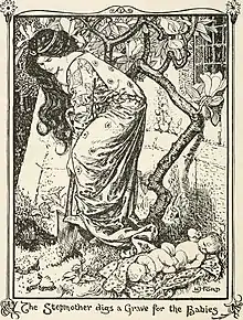 The stepmother digs up a grave in the garden to bury the young princes. Illustration by Henry Justice Ford for Andrew Lang's The Violet Fairy Book (1901).