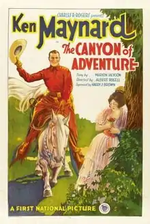 The Canyon of Adventure is a 1928 American silent Western film directed by Albert S. Rogell and written by Marion Jackson and Ford Beebe. The film stars Ken Maynard, Virginia Brown Faire, Eric Mayne, Theodore Lorch, Tyrone Brereton and Hal Salter. The film was released on April 22, 1928, by First National Pictures.[1][2][3]
