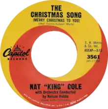 Recorded at Capitol Studios, New York City, March 30, 1961. This rendition, the first recorded in stereo,[13] is widely played on radio stations during the Christmas season, and has become the most popular/familiar version of this song.[4] Label credit: Nat King Cole (Nat King Cole, vocals; Hank Jones, pianist; John Collins, guitarist; Charlie Harris, bassist; Lee Young, drummer; Charlie Grean, Pete Rugolo and Ralph Carmichael, orchestral arrangement; Ralph Carmichael, orchestra conductor).[13][15] The instrumental arrangement is nearly identical to the 1953 version,[13] but Cole's vocals are deeper-sounding and more focused. Originally done for The Nat King Cole Story (a 1961 LP devoted to stereo re-recordings of Cole's earlier hits), this recording was later included in a reissue of Cole's 1960 album The Magic of Christmas replacing "God Rest Ye Merry Gentlemen". Retitled The Christmas Song, the album was issued in 1963 as Capitol W-1967(mono) / SW-1967(stereo) and today is available both on compact disc and streaming on iTunes. This recording of "The Christmas Song" has also been included on numerous compilation albums of Christmas pop standards (for example, WCBS-FM's Ultimate Christmas Album Volume 3). An alternate take of the 1961 recording, featuring a different vocal and missing the solo piano on the instrumental bridge, appears on the Deluxe Edition of the 2014 compilation The Extraordinary Nat King Cole.[13] There were several covers of Nat Cole's original record in the 1940s. The first of these was said to be by Dick Haymes on the Decca label, but his was released first  not recorded first. The first cover of "The Christmas Song" was performed by pop tenor and bandleader Eddy Howard on Majestic. Howard was a big Cole fan, and also covered Nat's versions of "I Want to Thank Your Folks" and "(I Love You) For Sentimental Reasons", among others.