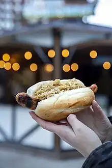 Several wooden booths and tents sell food specialties such as German bratwursts with sauerkraut, schnitzel, goulash, and Bavarian pretzels. A wide assortment of traditional sweet Christmas-food items like lebkuchen (gingerbread cookies), stollen, spekulatius, roasted nuts, cotton candy, chocolate covered fruits, waffles, and crepes are offered. In addition to hot drinks such as hot chocolate, coffee, and tea, Christmas Village offers Glühwein (mulled wine). [3][4][5]
