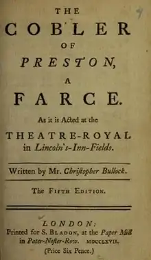 The Cobbler of Preston (first published as The Cobler of Preston) is a 1716 comedy play by Christopher Bullock, although a separate play of the same title was written by Charles Johnson the same year.[1] A one-act afterpiece is the origin of the phrase "Tis impossible to be sure of anything but Death and Taxes". In the preface to the published version Bullock suggested that he had begun writing the play just four days before its premiere.[2] It takes inspiration from The Taming of the Shrew by William Shakespeare and is set in Preston, Lancashire. The town had recently been scene of fighting during the 1715 Jacobite Rebellion at the Battle of Preston. Bullock's play does not overtly reference the rebellion, but has undertones supportive of the Hanoverian Dynasty.