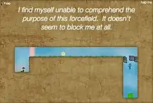 The Company of Myself is a 2009 Flash platformer by Eli Piilonen featuring a hermit as the protagonist whose depressed inner thoughts appears as writing on the "walls" of the game.[1] Piilonen has stated that the "core intent [of the game] is to be half puzzle game and half character study".[2] It's been frequently cited as an early example of an art game and has received praise for how it deals with issues of mental health.[3][4][5][6] Tom Fronczak of Destructoid called the game "brilliant".[1] It was included in Michael Rose's 2014 book "250 Indie Games You Must Play"[7] and has been frequently cited in video games research.[8][9][10][11][12][13] Piilonen later released a prequel for the game called Fixation.
