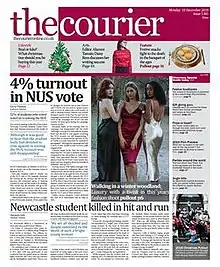 The Courier is the free student weekly newspaper of Newcastle University's Students' Union. It is entirely written and edited by student volunteers, except for the chief editor, which is a paid sabbatical officer position in the students union. Articles which are included in the 40-page print edition are also published online. The newspaper is divided into sections, including current affairs (news, campus comment, opinion, science); life and style (lifestyle, fashion and beauty, relationships, food and drink, travel); culture (film, tv, music, arts, gaming); sport and puzzles.