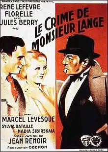 The Crime of Monsieur Lange (pronounced [mə.sjø lɑ̃ʒ]; French: Le Crime de Monsieur Lange) is a 1936 French drama film directed by Jean Renoir about a publishing cooperative. Imbued with the spirit of the communist/socialist Popular Front, which would score a major political victory in 1936, the film is an idyllic picture of a socialist France and is both a social commentary and a romance. It was shot at the Billancourt Studios in Paris. The film's sets were designed by the art director Robert Gys. It was distributed by the French subsidiary of Warner Brothers.[1]