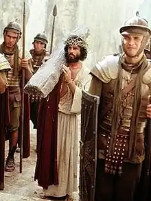Bishop, who did not accept the adaptation, had his name removed from the credits. He called the film "cheap revisionist history", and even tried unsuccessfully to change the film's title.[2] The Day Christ Died was filmed in Tunisia, at a cost of US$2.8 million.[3] It was broadcast by CBS-TV on Wednesday, March 26, 1980.[4]