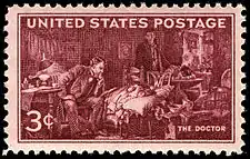 The painting has inspired poetry and film.[4] In 1911 it featured in a Punch cartoon commenting satirically on the effect of the National Insurance Act 1911 on doctors.[14] In 1933, the American artist Joseph Tomanek painted a version of the painting making small changes to the composition.[16] In 1947 it was reproduced on a United States postage stamp for the centenary of the American Medical Association,[9] which in 1949 used it in their campaign against nationalised medical care as proposed by President Harry S. Truman. The image was printed on 65,000 posters and brochures with the slogan, "Keep Politics Out of this Picture". This has been described as contributing to public distrust of nationalised medical care in the United States.[17] By contrast, in Britain it was used as the emblem for a celebration of Britain's National Health Service.[9]