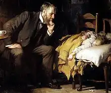 The most important personal influence was probably the death of Fildes' first child, his one-year-old son, Philip, from typhoid fever on Christmas morning, 1877.[5] Fildes' biographer has described how the boy's death compelled Fildes to paint a picture revolving around the compassionate Dr Murray visiting his dying child. The story was confirmed later by Fildes' second son, who described this as Fildes' "quickest painted of his 'big' pictures".[6]