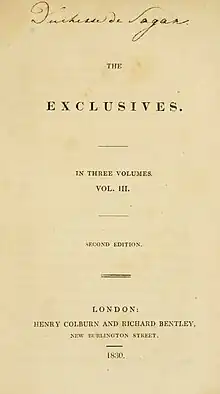 The Exclusives is an 1830 novel by the British writer Lady Charlotte Bury, originally published in three volumes. It is part of the then-popular genre of silver fork novels set in high society. It was also published in New York City by Harper the same year in two rather than three volumes. Although the daughter of a duke herself Bury, writing anonymously, used it as an expose of the manners and behaviour of the elite Ton.[1]