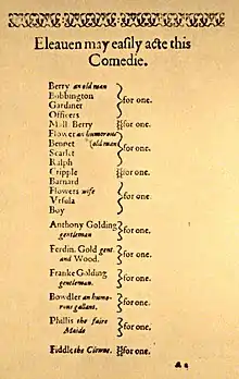 Stage direction at various parts of the play (e.g. Fight and beat them away at line 101, and Give them the letters and they stampe and storme at line 2130) strongly suggests that the play was performed.[6] Additionally, the division of 'dramatis personae' into 'Eleaven [who] may easily acte this comedie' is perhaps indicative of the 'division of labour' which would have been required for a travelling troupe. It is a possibility, then, that Thomas Heywood wrote the play for the purposes of performing it with his travelling company – Worcester's Men.[10] Nevertheless, no extant record of performance exists for this drama.