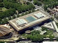The Field was the inaugural exhibition at the National Gallery of Victoria’s new premises on St Kilda Road, Melbourne.[1] Launched by the director of London’s Tate gallery, Norman Reid,[2] before an audience of 1,000 invitees, it was held between held 21 August and 28 September 1968. Hailed then,[3][4] and regarded since as a landmark exhibition in Australian art history,[5] it presented the first comprehensive display of colour field painting and abstract sculpture in the country in a radical presentation, between silver foil–covered walls and under geometric light fittings, of 74 works by 40 artists. All practised hard-edge, geometric, colour and flat abstraction, often in novel media including coloured or transparent plastic, fluorescent acrylic paints,[6] steel and chrome. The art was appropriate to a launch of the new venue itself, designed by architect Roy Grounds, and emphatically rectilinear; cubes nested in a basalt rectangular box amongst the other buildings of the new Arts Centre, each based on a geometric solid. Echoing emerging international stylistic tendencies of the time, The Field sparked immediate controversy and launched the careers of a new generation of Australian artists.