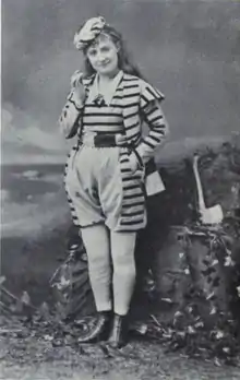 The primary gimmick of the show was that women played all the main male roles, just as Thompson had done with Ixion with great success when her troupe first came over from Britain in 1868. Ixion had played at the smaller Wood's Museum, so Thompson's move to Niblo's (which seated 3,200) for Forty Thieves demonstrated her troupe's growing popularity. In this show, women also played all of the forty thieves.[4] Thompson's success generated backlash and became the subject of an anti-burlesque sentiment that arose that year.[5] Despite the negative attacks on burlesque's "leg business", Forty Thieves ran until May 1869. Its take in February 1869 was $54,487, the best month of any New York theater for two years, and better than the long-running Black Crook had done in any month.[4]