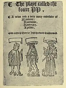 The Play called the foure PP; a newe and a very mery interlude of a palmer, a pardoner, a potycary, a pedler or The Four PP (pronounced "pees", plural of the name of the letter P) is an interlude by John Heywood written around 1530 that relates the tale of four men whose trades begin with the letter P. The characters in the play include two churchmen (a Pardoner and a Palmer), a medieval pharmacist (an aPothecary), and a Pedlar.[1] The play has no female characters. [2]