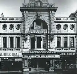 May 1941 saw both the Futurist & the adjacent Scala Cinema suffering bomb damage. The exact date in unclear, but a newspaper cutting[4] from the period suggests a date no later than the 5th, and the area is known to have been very badly damaged on the 3rd.[5] It was rebuilt and reopened in minimal time & was showing films by June that year. This saw the original pediment replaced with a less ornate classical style version.