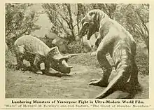 The Ghost of Slumber Mountain is a 1918 film written and directed by special effects pioneer Willis O'Brien, produced by Herbert M. Dawley, and starring both men. It is the first film to show live actors and stop-motion creatures together on the screen[2][3] and is often cited as a trial run for The Lost World. An advertising tagline for the film read "These giant monsters of the past are seen to breathe, to live again, to move and battle as they did at the dawn of life!". The film attracted the interest of Watterson R. Rothacker, founder of the Industrial Motion Picture Company, who was so impressed by the film's special effects, he joined forces with O'Brien to create the dinosaurs of The Lost World (1925), a classic that advanced the development of special effects techniques.[4]