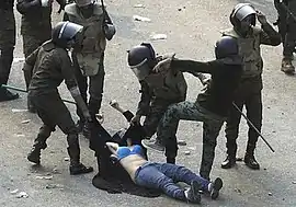 A video recorded from an aerial view then emerged of a woman trying to flee from the Square in a street adjacent to the Egyptian Cabinet, only to stumble and fall to the ground.[13][14] The security forces caught up to her and beat her severely. The soldiers began stomping her and hitting her with their batons. As they began dragging her away, her abaya fell from her body, revealing her stomach, jeans, and bra. The soldiers continued to stomp her body, though she seemed to be unconscious.[13][14][1]