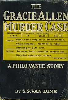 The Gracie Allen Murder Case (1938) (also published as The Scent of Murder) is the eleventh of twelve detective novels by S. S. Van Dine featuring his famous fictional detective of the 1920s and 1930s, Philo Vance. It also features the zany half of the Burns and Allen comedy team. It is in some ways a roman à clef, including not just Burns and Allen but also such characters as Gracie's mother and brother. (George Burns, after all, has described the couple's act as, "All I had to do was ask, 'Gracie, how's your brother?' and she talked for 38 years.") That gave the book an unusual feel, as did the comic tone of much of Gracie's dialogue. This tone suddenly shifts in a later chapter to one character's philosophically anguished speculations, and then back again to Gracie.