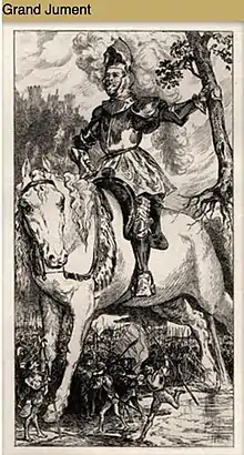 Deemed "bigger and more monstrous than any mare we have ever seen", the Grand Mare was a gift from Africa sent by "Fayoles, Tetrarch King of Numidie".[26] She was used solely as a means of transport for the giants.[21] She herself was transported to Olone, in Thalmondoys, by four ships including three large Genoese sailing vessels, the "carracks". Her size was that of "six elephants",[27][13] she had the hanging ears of a Languedoc goat, with her "feet split into fingers like Jules César's horse[21] [...] and a small horn on the flank". Her coat was that of burnt chestnut dappled gray in some spots.