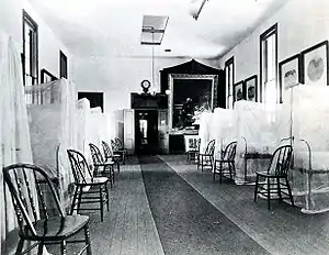 Here, surgeons crowd around the anesthetized patient in their frock coats—this is just prior to the adoption of a hygienic surgical environment (see asepsis). The Gross Clinic is thus often contrasted with Eakins's later painting The Agnew Clinic (1889), which depicts a cleaner, brighter, surgical theater, with the participants in "white coats".[2] In comparing the two, the advance in understanding of the prevention of infection is seen. Another noteworthy difference in the later painting is the presence of a professional nurse, Mary Clymer, in the operating theater.