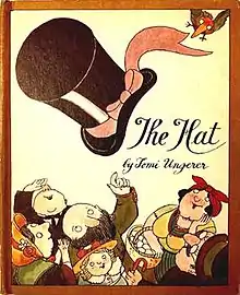 The Hat is a children's book written and illustrated by French artist and author Tomi Ungerer. Published in 1970 by Parents' Magazine Press, the book tells the story of a poor veteran, Benito Badoglio, who becomes rich after he unwittingly gains possession of a magic flying top hat. The book is richly illustrated and the text contains numerous vivid and mellifluous descriptions and dialog. For example, upon meeting the top hat, the protagonist cries, "Thunder of Sebastopole!"; in another scene, he shouts, "A thousand Potemkins!" Other characters in the book are "cutthroats", "brigands", a "fainting contessa", and a "dashing cadet".[1] The author's interest in such colorful prose was explained by Selma G. Lanes in the Atlantic Monthly: "Ungerer feels strongly that children enjoy unfamiliar words and euphonious, mystifying phrases."[2] The setting for The Hat is nineteenth century Italy,[3] and was described by Sydney D. Long in the Horn Book Magazine as "a never-never land ..., the comic-opera pictures of The Hat are full of mandolin-playing musicians, splashing fountains, and apple-cheeked peasant lasses."[4]
