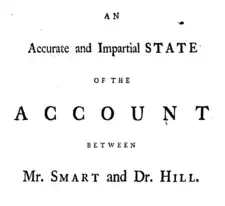 Included in the work is "An Accurate and Impartial STATE of the ACCOUNT Between Mr. Smart and Dr. Hill."[16] The "account" includes 12 essays, six by Hill that claims Smart as his "debtor" for various "praises" and six that are "per contra creditor" over "his abuse".[17] Although the "account" compiles all of the essays together, the original essay written by Hill was published 9 March 1751 and was not followed until 13 August 1752.[17] At one point, John Newbery actually included a publisher's note to directly attack Hill's claims that he helped establish Smart by introducing the young poet to Newbery.[18] The reason for adding the twelve "accounts" becomes clear when the editor ads the essays together and claim that The Hilliad is "Due on the Balance to the INSPECTOR."[19] Although the "accounts" are satirically laid out, according to Lance Bertelsen, they represent "precisely the exchange of praise and abuse, and the notoriety established by such exchanges, that generated sales that put shillings in capricious hungry authors' pockets."[20]