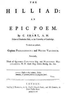 During this conflict, Smart tried to publish his first collection, and the 851 people subscribers to Smart's Poems could not keep it from coming under attack.[2] In the August 1752 Monthly Review, Hill derided the Poems and singled out The Hop-Garden for a particularly harsh review.[8] Combined with other attacks, Hill began to provoke Smart into a literary conflict.[9] On 11 November 1752, Smart announced his production of The Hilliad in the Gray's-Inn Journal.[10]