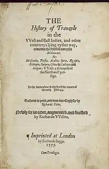 1. "The history of trauayle in the VVest and East Indies, and other countreys lying eyther way, towardes the fruitfull and ryche Moluccaes : As Moscouia, Persia, Arabia, Syria, Ægypte, Ethiopia, Guinea, China in Cathayo, and Giapan : Vvith a discourse of the Northwest passage / Gathered in parte, and done into Englyshe by Richarde Eden. Newly set in order, augmented, and finished by Richarde VVilles. - Yale University Library". brbl-dl.library.yale.edu. Retrieved 17 July 2020.
