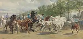The Horse Fair is an oil-on-canvas painting by French artist Rosa Bonheur, begun in 1852 and first exhibited at the Paris Salon in 1853. The artist added some finishing touches in 1855. The large work measures 96.25 in × 199.5 in (244.5 cm × 506.7 cm).[1]