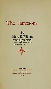 The Jamesons is a novel by American writer Mary E. Wilkins, first published in 1899. It is narrated in the first person by a character named Sophia. The story she tells began six years before and takes place in a small New England town, often referred to as a village, named Linnville. The town is set in the country and is composed of a small community where people are by no means rich, but are able to live comfortably. The lifestyles and traditions of the community are disrupted, in both positive and negative ways, when the Jamesons come to town. The Jamesons are a very wealthy family from New York City who come to Linville for the summer, and eventually buy a permanent summer home there. The mother of the family, Mrs. H. Boardman Jameson, tries to “improve” the community through readings of formal literature and attempts to change the way the people eat, dress and decorate their homes on both the interior and the exterior. Many people are unhappy about her superior attitude and total disregard of other people's opinions on the changes she attempts to make, but she gains respect at the end of the novel after planning an elaborate Centennial celebration for the town.