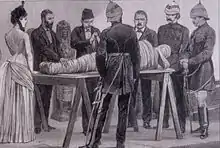 Egyptology and the fascination with ancient artifacts were echoed in nineteenth-century literature. Between 1860 and 1914, hundreds of stories about Egyptian mummies, curses, and exploration were published. Roger Luckhurst situates this within a cultural trend of what he calls Egyptian Gothic, "a set of beliefs or knowledges in a loosely occult framework" developed in response to British anxieties about the rule of Egypt.[6] One common plot in these narratives was the "Mummy’s Curse", which "follows the basic plot structure of misappropriation of tomb artifacts with fatal consequences following the protagonist home and features the explicit warning 'beware of the Mummy’s Curse'”;[7] often these artifacts were possessed by some supernatural element. Mummies were often the focal point of these stories, usually of noble rank, because most of the mummies being discovered in the nineteenth century were pharaohs. There was an emphasis on the idea of perfect preservation and beauty; mummies were unraveled at museum exhibitions in British museums, and audiences were amazed by their "almost perfect condition".[8] Because of their preserved beauty, female mummies in Victorian fiction were often eroticized objects of desire.[9]
