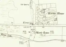 Approximately 80 meters to the south of The Kirna's perimeter wall, across the A72, is the site of Kirnie Tower. Its site was pointed out in 1856 by residents of Walkerburn who were present at its removal in circa 1840 when its stones were removed for building purposes elsewhere on the Horsburgh estate. Long after its dismantlement it was used as a shepherd's hut.[92] Maps published as far back as 1654 refer to "Kirn" or "Kirna" in approximately the location of Kirnie Tower.[93] Ordnance Survey Name Books in the mid-1800s record the structure as "one of the ancient feudal residences erected for the protection of the Borders. It was square in appearance".[94][95][92]