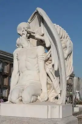 The Kiss of Death (El petó de la mort in Catalan and El beso de la muerte in Spanish) is a marble sculpture located in Poblenou Cemetery in Barcelona. The sculpture is believed to have been crafted by Jaume Barba in 1930, as his signature is present on the side of the sculpture. However, some suggest that it might have been designed by Barba's son-in-law, Joan Fontbernat.[1] The sculpture serves as an example of memento mori, portraying death as a winged skeleton bestowing a kiss on the forehead of a young man.