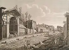 The Roman city of Pompeii, south of Naples, was under active excavation in the early 19th century, work having begun on the city and its neighbour Herculaneum in the middle of the previous century.[2] Artists were well aware of its potential as a subject. John Martin had painted The Destruction of Pompeii and Herculaneum in 1822 and others had sketched and produced engravings of the site.[1]