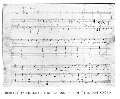 "The Lost Chord" is a song composed by Arthur Sullivan in 1877 at the bedside of his brother Fred during Fred's last illness. The manuscript is dated 13 January 1877; Fred Sullivan died five days later. The lyric was written as a poem by Adelaide Anne Procter called "A Lost Chord", published in 1860 in The English Woman's Journal.[1]