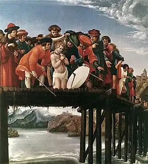 Behind Florian, young, naked and kneeling, is the group of torturers and simple onlookers, and the large grindstone tied to his neck is in front of him. His serene acceptance of martyrdom contrasts with the excited and distorted faces of the other characters, which effectively bring out his sanctity. Below the bridge, a beautiful river landscape is depicted.