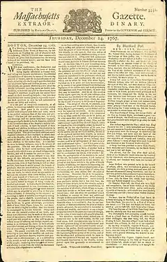 Draper's father, John Draper, was the publisher of The Boston News-Letter who for thirty years was its publisher. On the death of his father in November 1762, Richard Draper took over publication of the News Letter. This newspaper was devoted to the royal British government and in the controversy between Great Britain and the colonies he, as a Loyalist, supported the British Crown through this newspaper. Richard enlarged the newspaper title to The Boston Weekly News Letter and New England' Chronicle. A year later he changed it again to The Massachusetts Gazette; and Boston News Letter and printed the emblem of the King's arms in the heading.[1][2] In 1768 it was united with The Boston Post-Boy. Draper's Post-Boy , was a Tory newspaper that seldom went afield from the British party line. He had the printing contract for Governor Bernard and the council and used the words Massachusetts Gazette as a part of the title.[3] The union of these two newspapers was something of an unusual match and lasted only a short term. Although the united newspapers were both called The Massachusetts Gazette, each continued as a separate publication; The Post-Boy was released on Mondays, with The News-Letter appearing on Thursdays. Together they came to be known as the "Siamese Twins" in journalism.[4][5] This arrangement lasted from May 23, 1768, until September 25, 1769. Draper, upon his separation of the twin newspapers, kept alive only The News-Letter.[6]