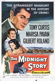 The Midnight Story is a 1957 American CinemaScope film noir crime film directed by Joseph Pevney and starring Tony Curtis, Marisa Pavan and Gilbert Roland. The film was originally slated to be titled The Eyes of Father Tomasino, after the 1955 Lux Video Theatre TV episode it was based on.[1][2]