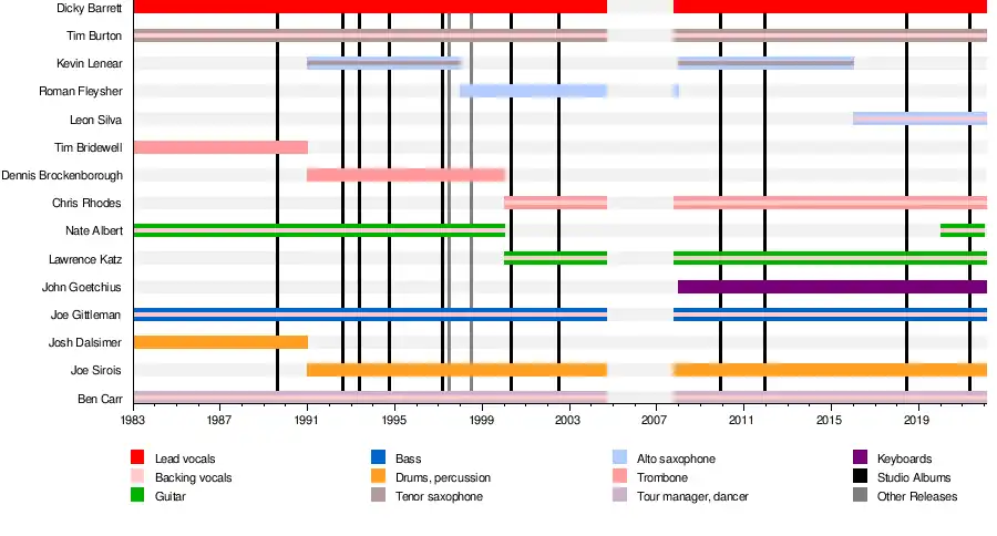The band has been typically aligned with ska punk.[23][24][25][26][27] The L.A. Times, described their sound as "blending the brassy after-beat groove of ska with the uncompromising intensity of hard-core punk".[28] The Tampa Bay Times described it similarly as an "eclectic swirl of good-time music fuses the perky pick-it-up sound of pre-reggae ska with monstrous hard-core guitars."[29] AllMusic credited them as being "one of the first bands to cross high-energy ska with hardcore punk and hard rock guitars", and "[laying] a great deal of the groundwork for the mid- to late-'90s ska explosion, helping shift its tone toward party music."[30] The Boston Herald said that they "were one of the first bands to cross high-energy ska with hardcore punk and heavy metal.".[31]